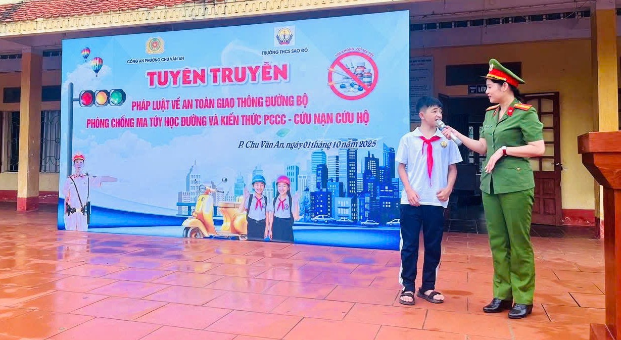 Thực hiện nhiệm vụ, kế hoạch hoạt động tháng của nhà trường năm học 2025-2026. Nhằm nâng cao nhận thức,ý thức chấp hành pháp luật cho học sinh trường THCS Sao Đỏ. Sáng nay, ngày 1/10/2025 nhà trường phối hợp cùng công an phường Chu Văn An tổ chức buổi tuyên truyền: Pháp luật về an toàn giao thông đường bộ, phòng chống ma túy học đường và kiến thức PCCC, cứu nạn cứu hộ.