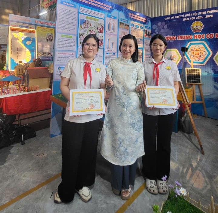 Nhà trường trân trọng chúc mừng cô giáo hướng dẫn Trần Thị Ngọc Mai và học sinh Nguyễn Mai Trang, Nông Hà Châu đã xuất sắc vượt qua nhiều sản phẩm khác của phường Chu Văn An có dự án tham gia Vòng Chung khảo Cuộc thi Nghiên cứu Khoa học Kỹ thuật (KHKT) dành cho học sinh THCS cấp thành phố năm học 2025–2026.